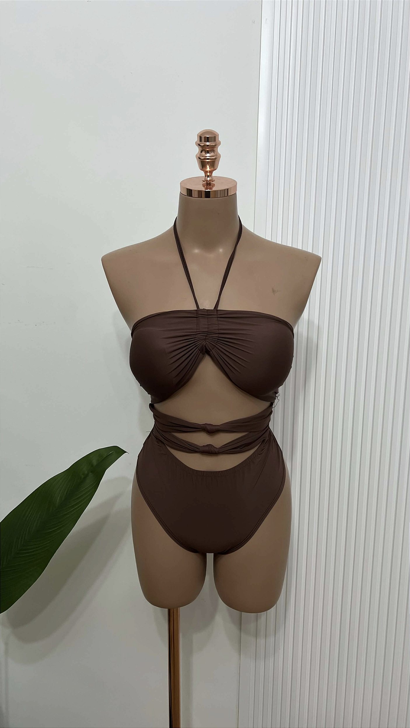 Body marrom com modelagem tomara que caia e alça frente única, possui detalhe franzido no busto e recortes com tiras na cintura, criando um visual moderno e sensual.