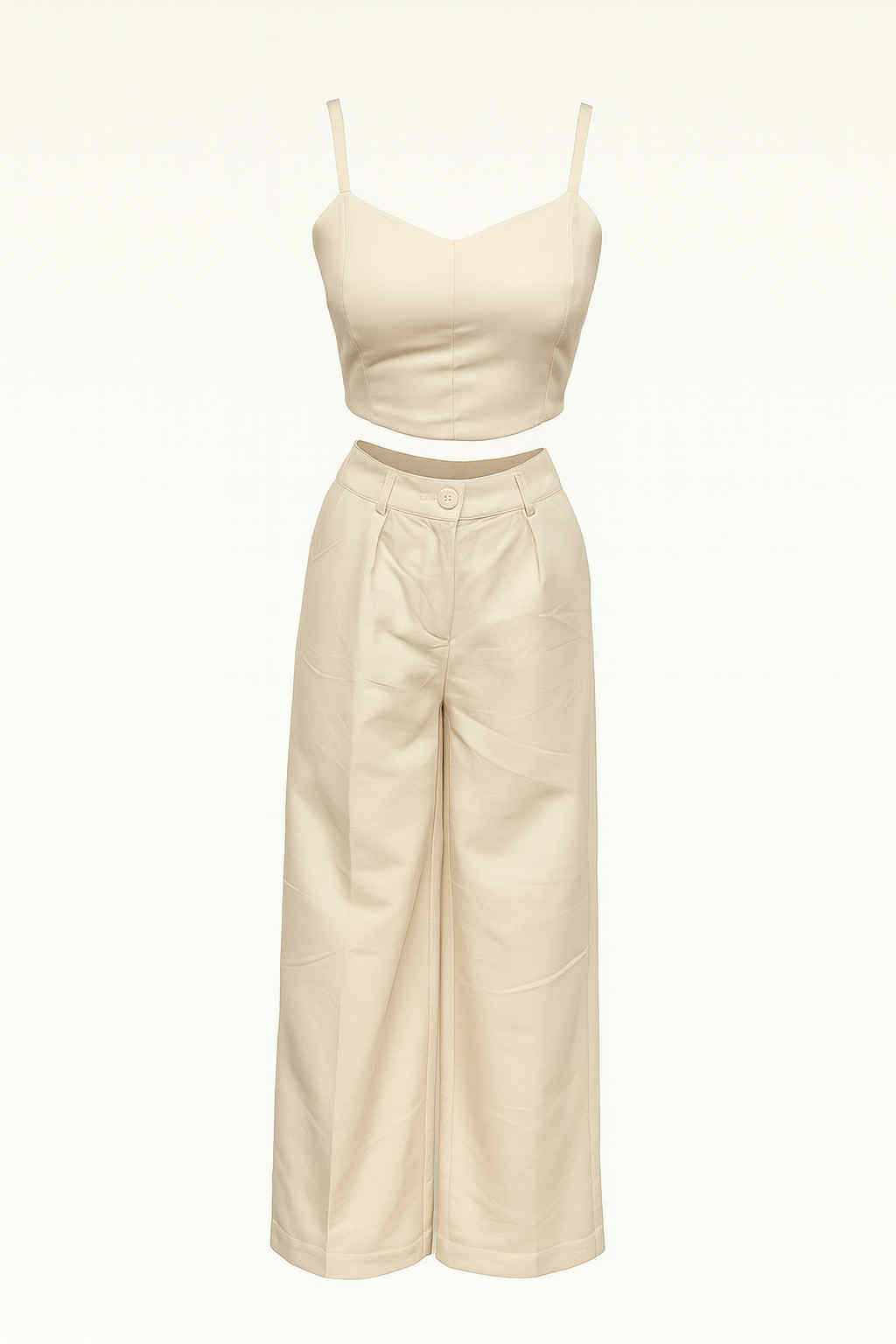 Esse conjunto bege é a combinação perfeita de sofisticação e leveza. O top cropped apresenta alcinhas finas e um recorte estruturado que valorizhhhhhhhha o busto com caimento impecável. A calça de cintura alta possui modelagem ampla tipo pantalona, com pregas frontais e fechamento por botão e zíper, trazendo elegância e conforto ao mesmo tempo. Feito em tecido leve e de toque suave, o conjunto é ideal para composições casuais ou produções mais refinadas — basta mudar os acessórios. Um look versátil, moderno e atemporal que realça a silhueta com delicadeza. Detalhes: • Cor: Bege claro • Top cropped com alças finas e busto estruturado • Calça de cintura alta com pregas e modelagem ampla • Fechamento frontal com botão e zíper • Tecido confortável e de toque macio