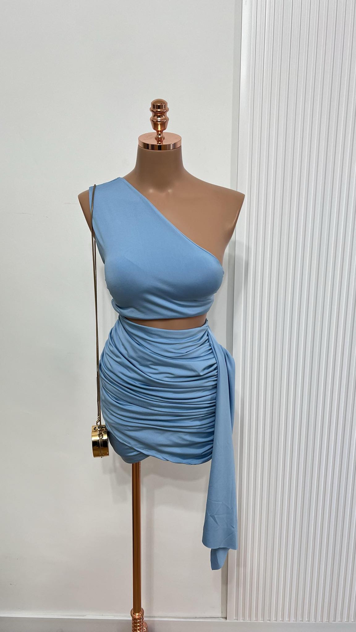 O conjunto azul one shoulder é pura sofisticação e sensualidade. O cropped de um ombro só valoriza o colo com elegância, enquanto a saia curta drapeada modela o corpo e traz aquele charme extra com a amarração lateral. Uma peça perfeita para destacar a feminilidade em festas, jantares ou produções noturnas cheias de estilo.