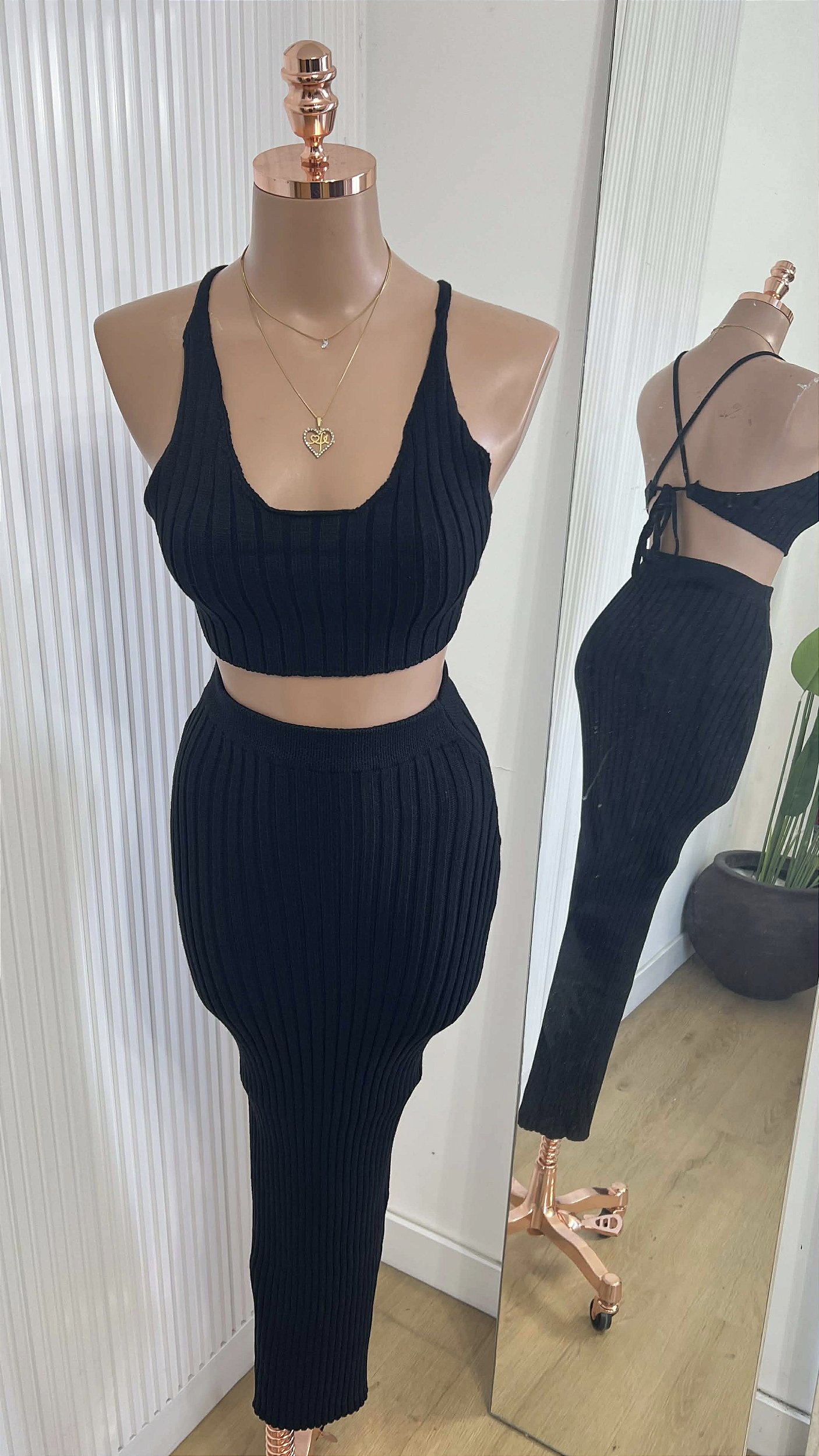 Conjunto feminino em malha canelada composto por cropped e saia longa. O cropped tem decote em U, alças finas e costas com tiras cruzadas ajustáveis, garantindo charme, conforto e um ótimo caimento no corpo. A saia longa possui cintura alta e modelagem ajustada, valorizando a silhueta. Um conjunto moderno, versátil e ideal tanto para o dia quanto para a noite.