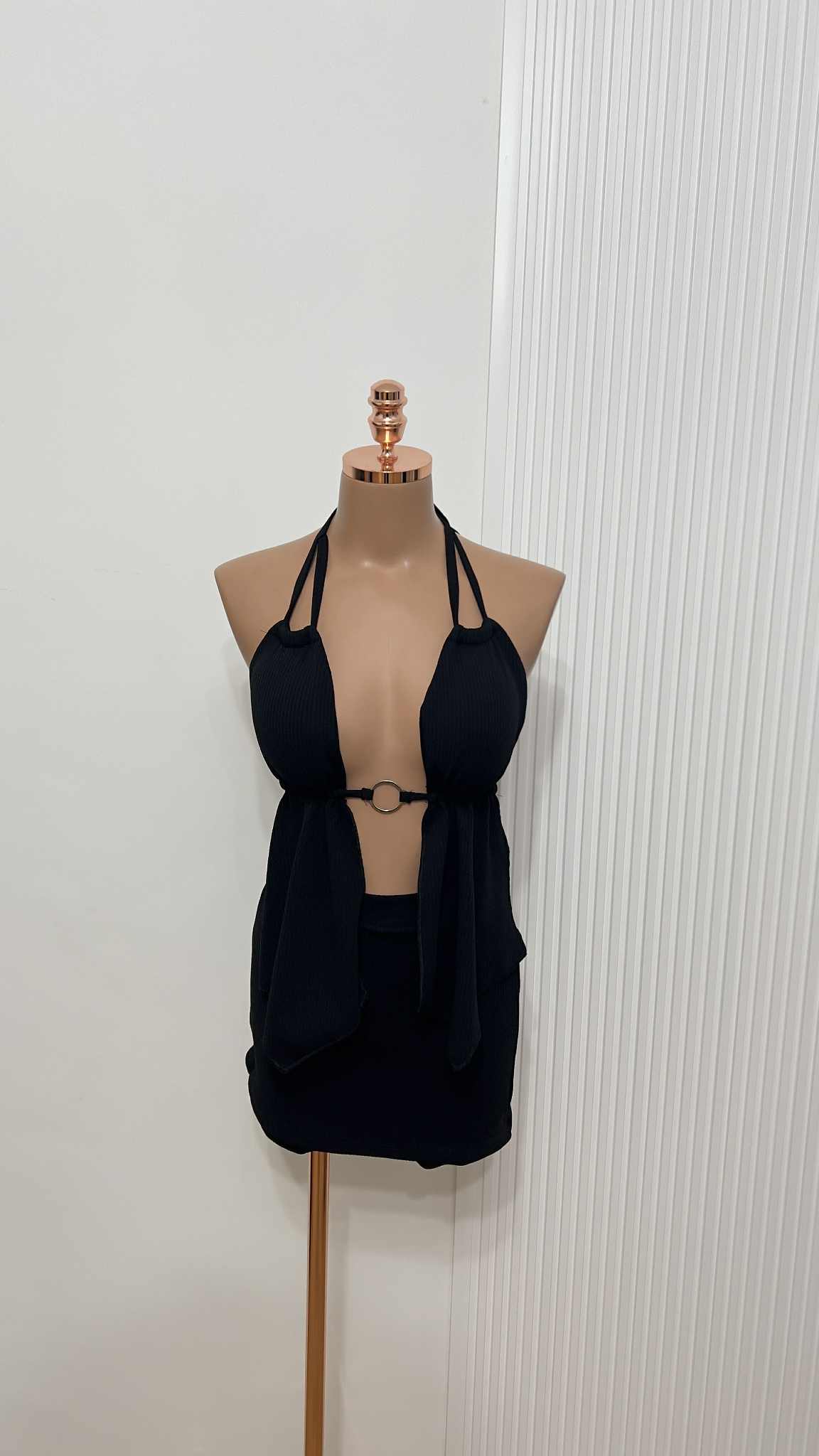Conjunto preto composto por top frente única com detalhe de argola central e amarração no pescoço, acompanhado de saia curta justa. Um look moderno e ousado, perfeito para baladas e eventos noturnos.