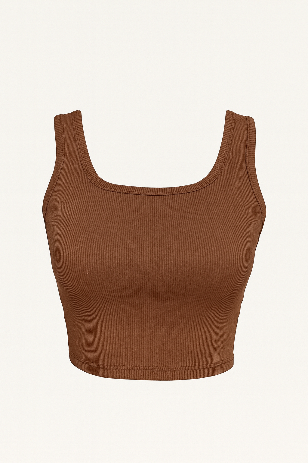 Cropped marrom canelado com decote quadrado e modelagem ajustada ao corpo. Feito em tecido macio e elástico, é uma peça versátil e confortável para compor looks casuais ou mais estilosos.