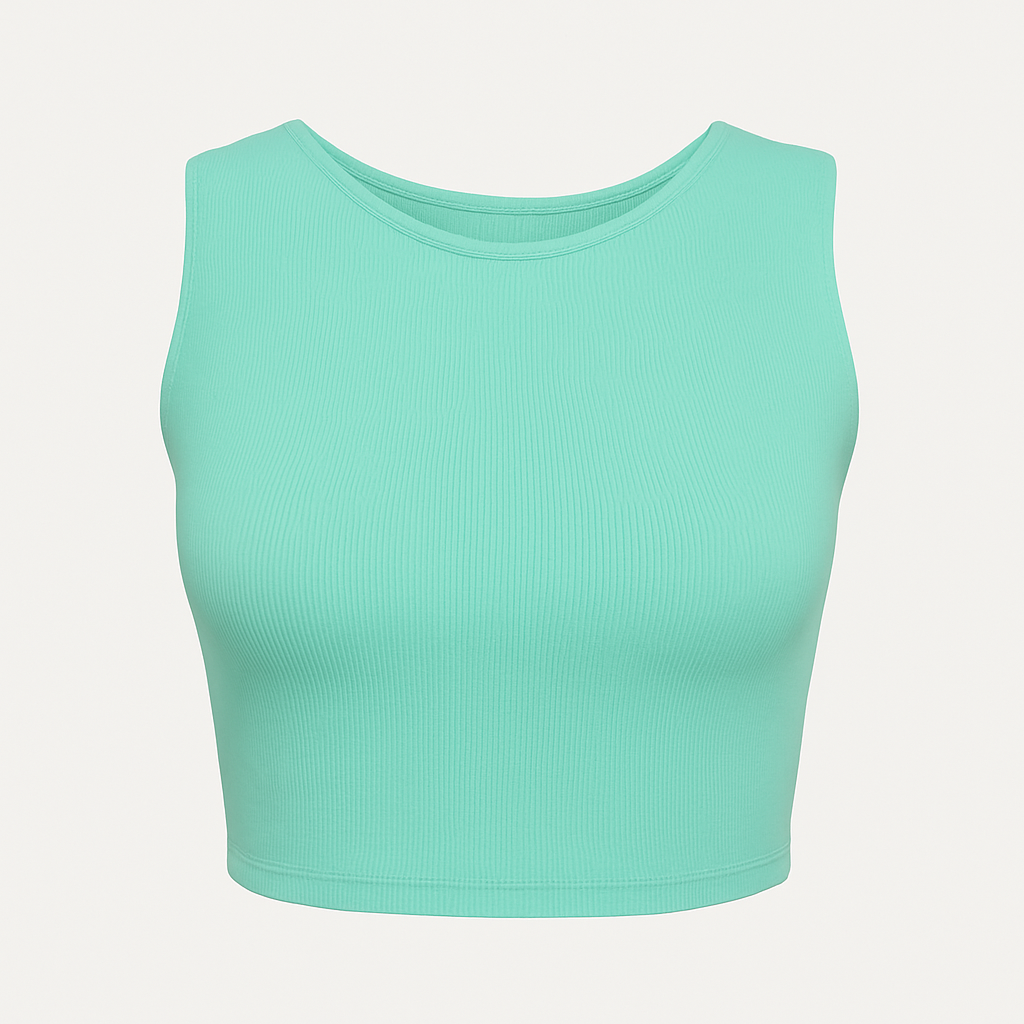 Cropped verde claro em tecido canelado, com gola redonda e modelagem justa que valoriza o corpo. Confortável e versátil, combina com tudo do jeans à alfaiataria — deixando o look moderno e leve.