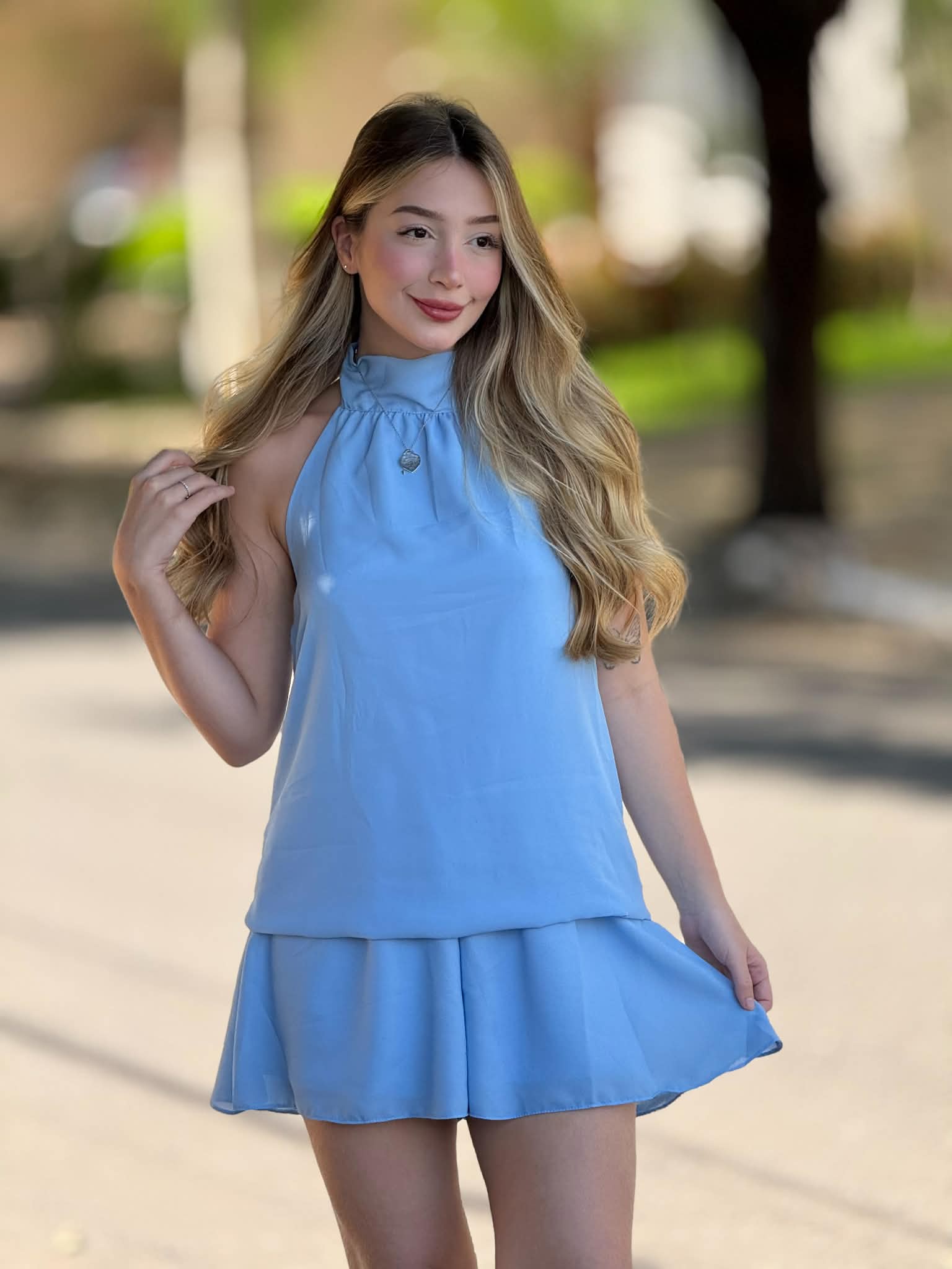 Macaquinho feminino com modelagem soltinha e elegante, confeccionado em tecido leve que proporciona conforto e movimento. Possui gola alta estilo halter com leve franzido na parte superior, valorizando o colo e trazendo um toque sofisticado ao look. A parte inferior tem acabamento em efeito saia com short interno, garantindo praticidade e segurança. A cor azul claro transmite delicadeza e frescor, ideal para composições casuais e modernas.