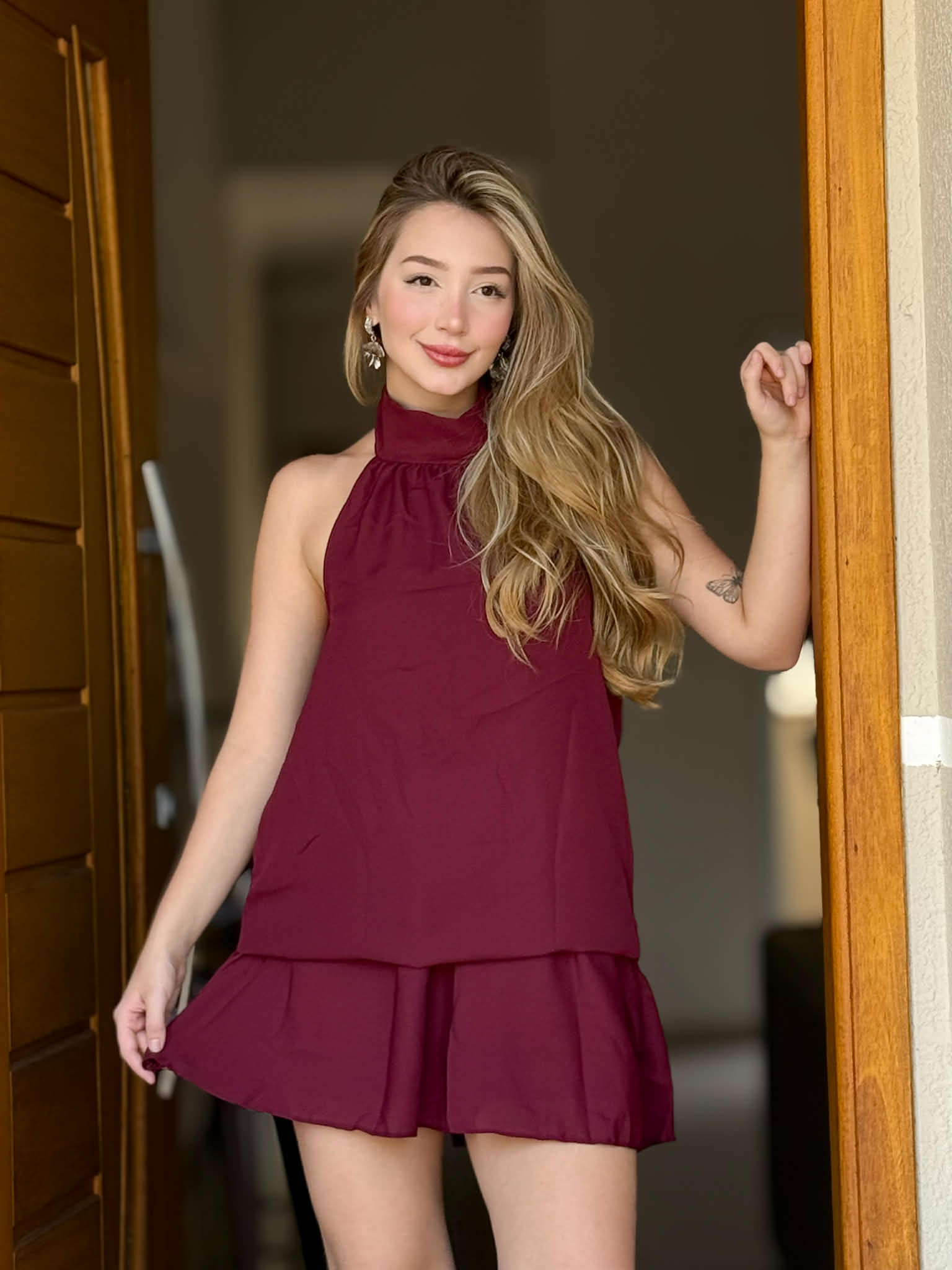 Macaquinho feminino com design elegante e moderno, confeccionado em tecido leve com ótimo caimento. Possui gola alta estilo halter que valoriza o colo e traz sofisticação ao look. A modelagem soltinha garante conforto, enquanto a parte inferior com efeito de saia e short interno oferece praticidade e segurança. A cor marsala adiciona um toque refinado, perfeita para compor produções casuais ou mais arrumadas.