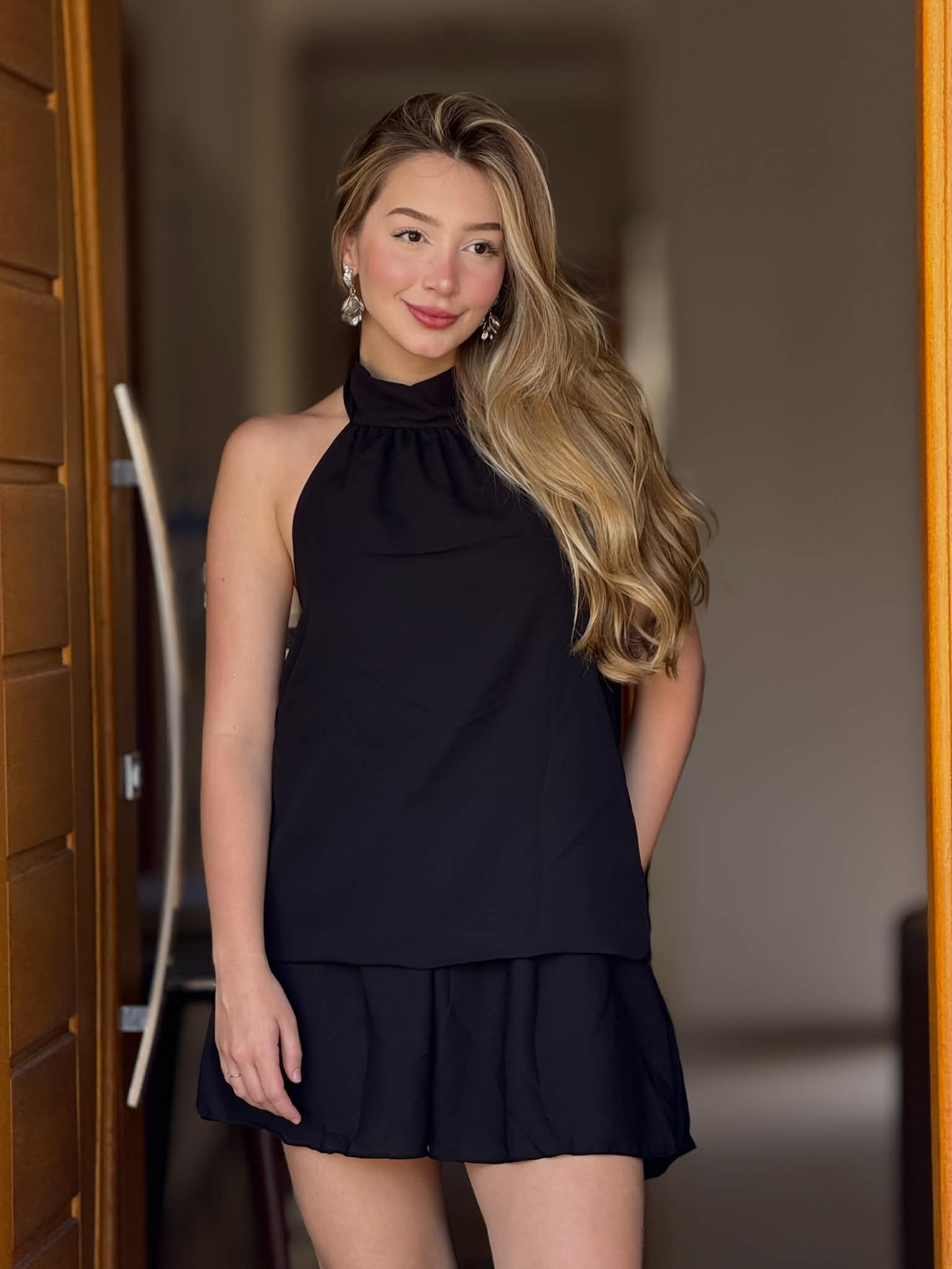 Macaquinho feminino com modelagem soltinha e elegante, confeccionado em tecido leve que proporciona conforto e movimento. Possui gola alta estilo halter com leve franzido na parte superior, valorizando o colo e trazendo sofisticação ao visual. A parte inferior possui efeito de saia com short interno, garantindo praticidade e segurança. A cor preta é clássica e versátil, perfeita para compor looks modernos tanto para o dia quanto para a noite.