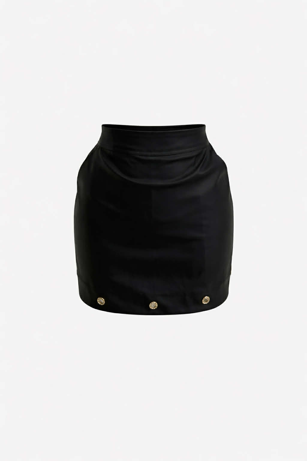 Saia curta em couro preto com modelagem ajustada que valoriza a silhueta. Possui aplicações metálicas na barra, trazendo um toque moderno e sofisticado. Versátil, é perfeita para compor looks elegantes ou mais ousados.