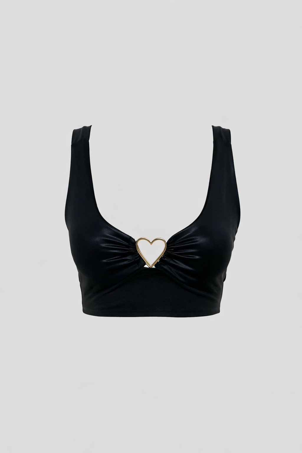 Top cropped preto com alças largas e decote em V, valorizando o colo e oferecendo bom ajuste ao corpo. O destaque fica por conta do detalhe metálico em formato de coração no centro, trazendo um toque moderno e sofisticado à peça. Ideal para compor looks noturnos ou combinações fashionistas com saias, calças ou shorts de cintura alta.