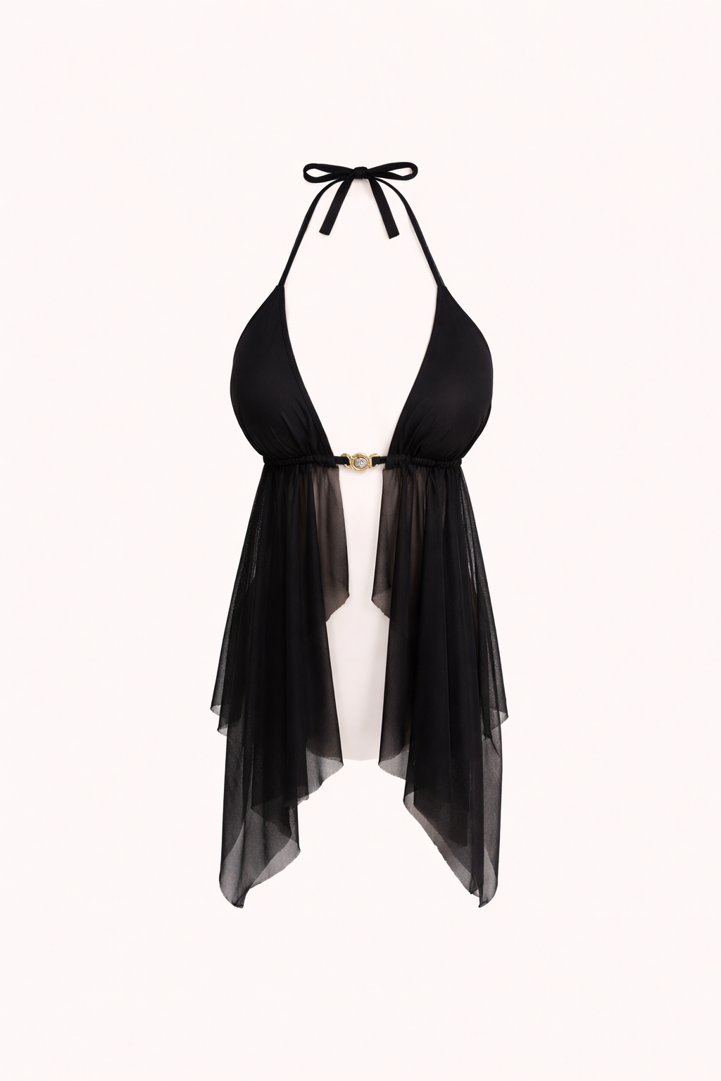 Este top une a sofisticação do preto com a leveza do tule. O modelo possui decote profundo realçado por um detalhe dourado no centro do busto e acabamento em pontas fluidas que garantem movimento à peça. Possui amarrações ajustáveis no pescoço e nas costas para um caimento perfeito.