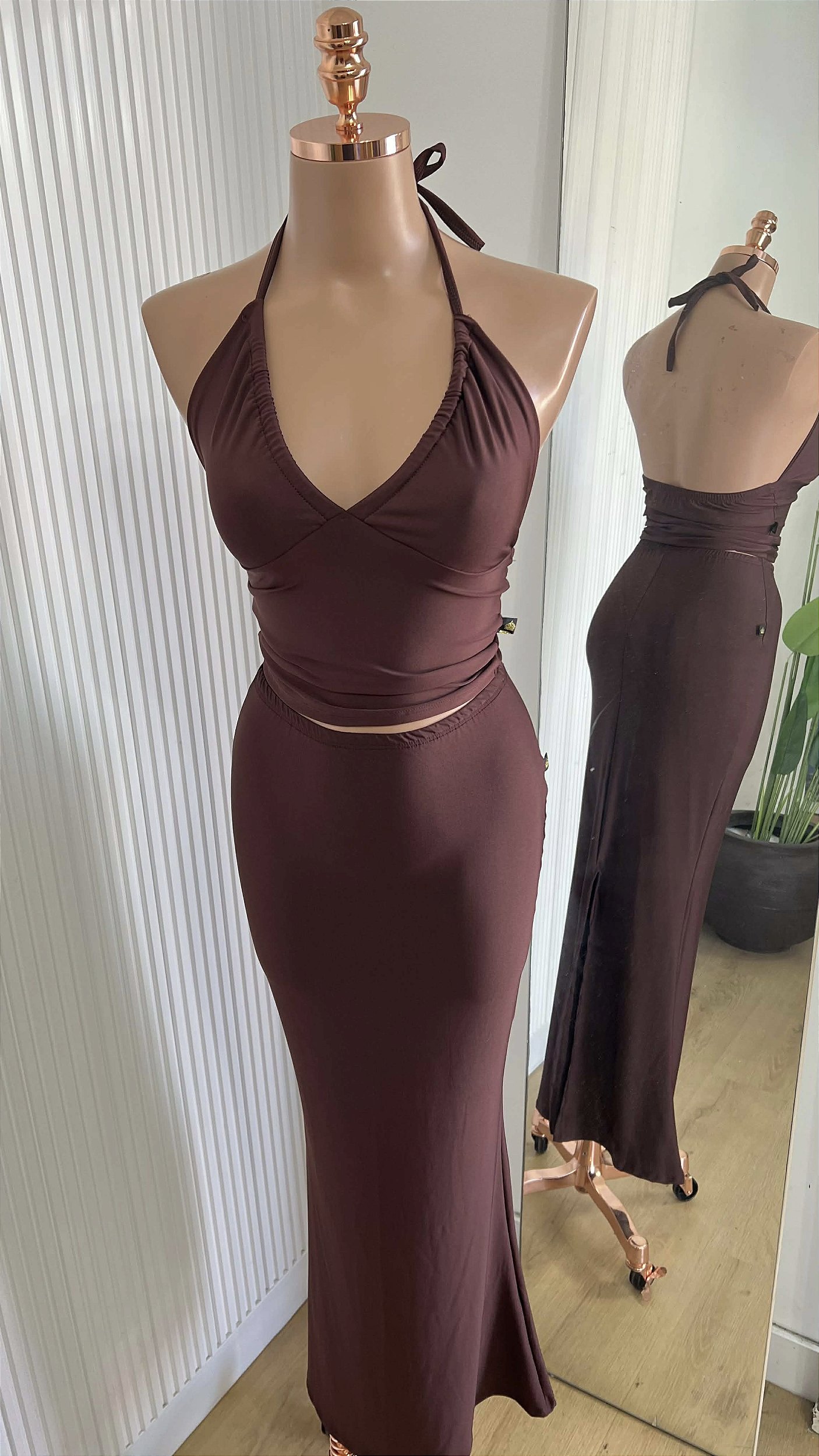 Conjunto feminino composto por top halter e saia longa. O top possui decote em V com leve franzido no busto e amarração no pescoço, proporcionando ajuste confortável e valorizando o colo. A saia longa tem modelagem reta, caimento leve e cintura confortável. Confeccionado em tecido macio e flexível, ideal para looks elegantes, modernos e versáteis para o dia ou noite.