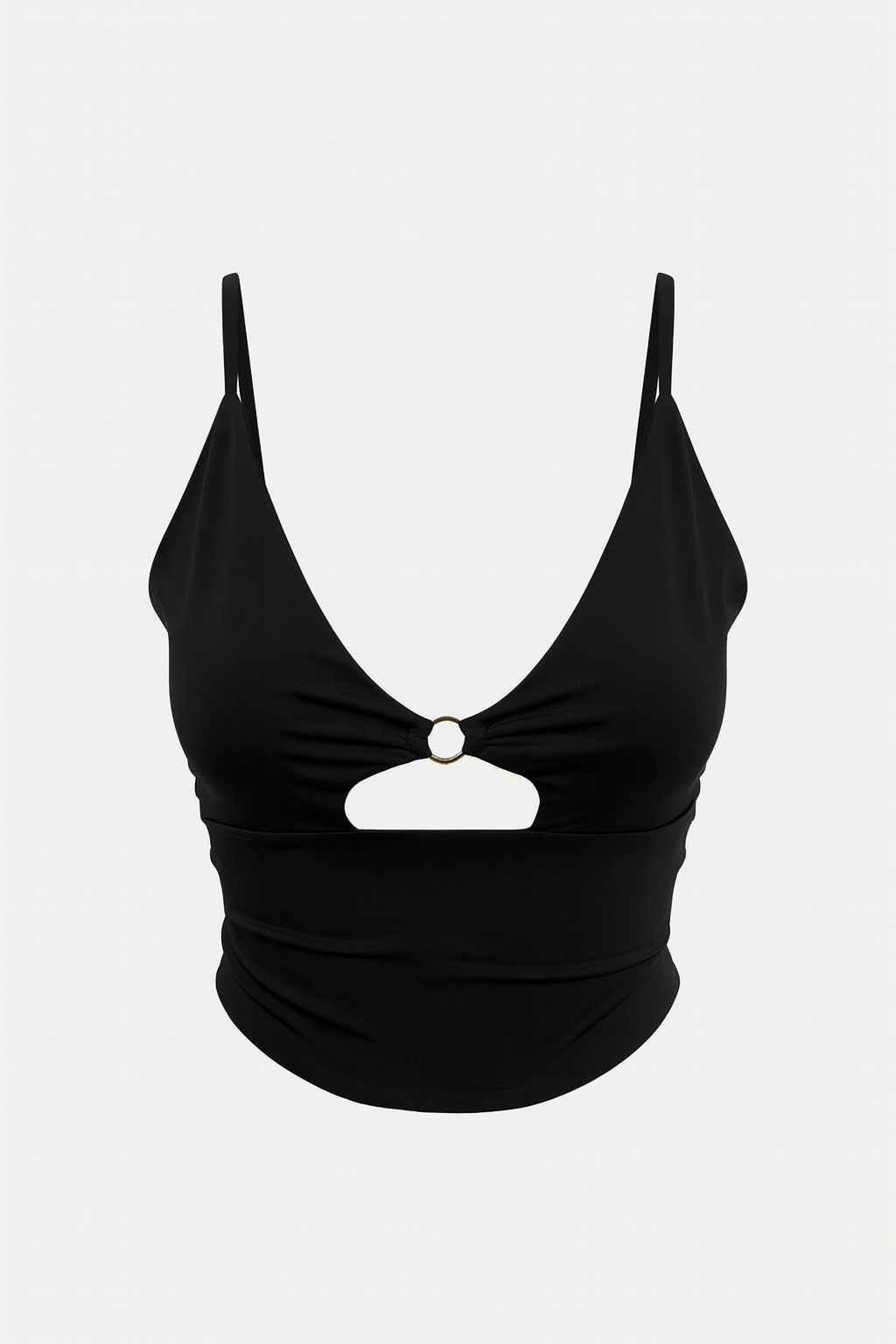 Top preto com alças finas e detalhe de argola central que forma um leve recorte abaixo do busto. Confeccionado em tecido confortável e com ótimo caimento, é ideal para looks casuais ou produções mais elegantes.