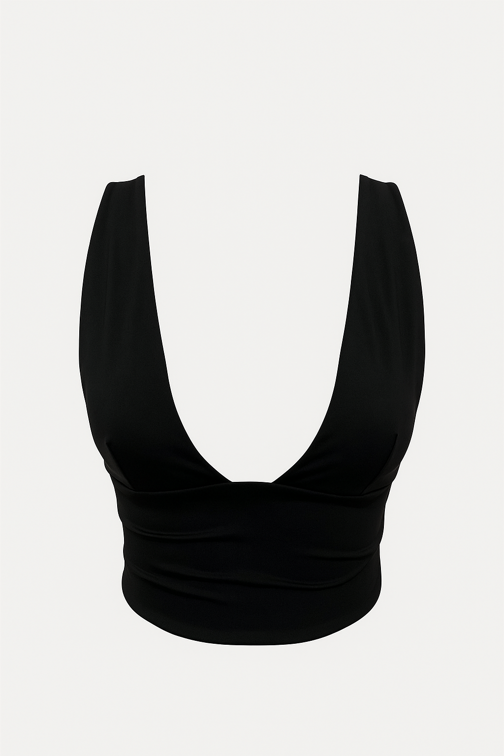 Top preto com decote em V profundo e modelagem justa ao corpo. Confeccionado em tecido leve e confortável, é ideal para compor looks modernos e versáteis, do dia à noite.
