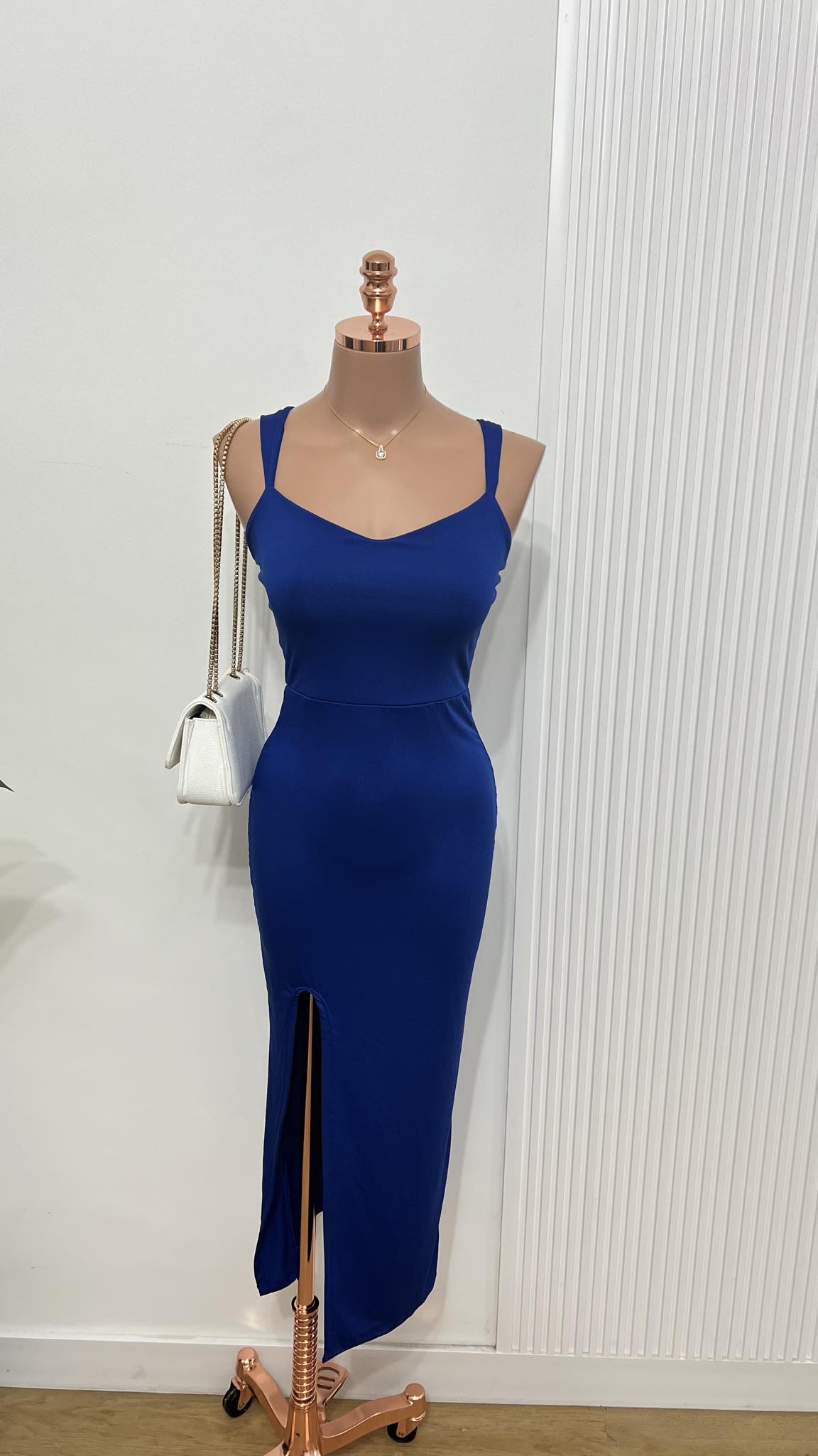 Vestido azul midi com alças largas e fenda frontal. Modelo justo, confortável e elegante, ideal para eventos, jantares ou saídas à noite.