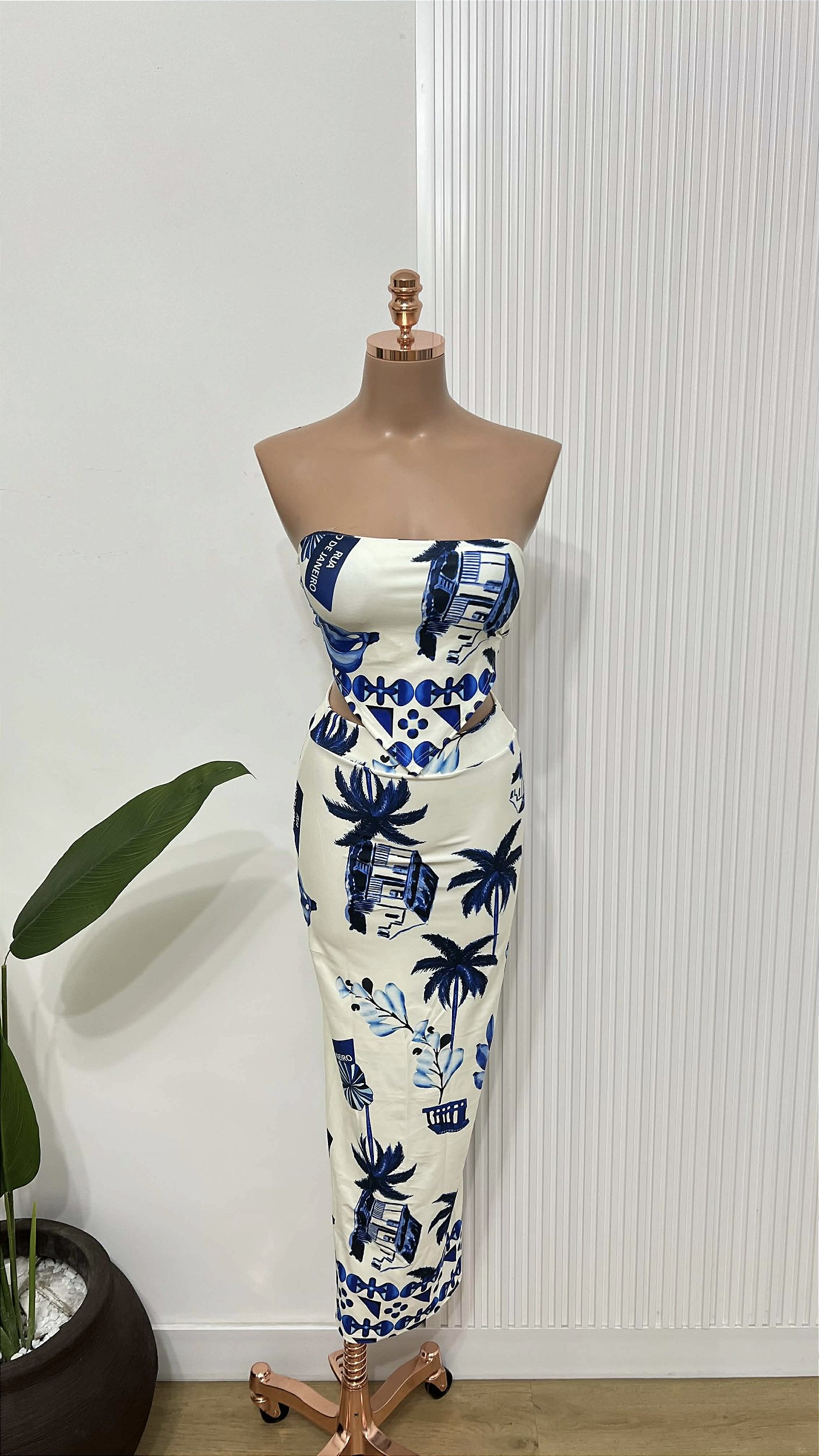 Vestido longo de modelagem ajustada, com decote tomara que caia, confeccionado em tecido com elasticidade para melhor caimento e conforto. A estampa em azul e branco traz um visual elegante e sofisticado, com elementos gráficos e tropicais que valorizam a peça. Ideal para ocasiões especiais, eventos, jantares ou produções modernas com um toque de estilo.