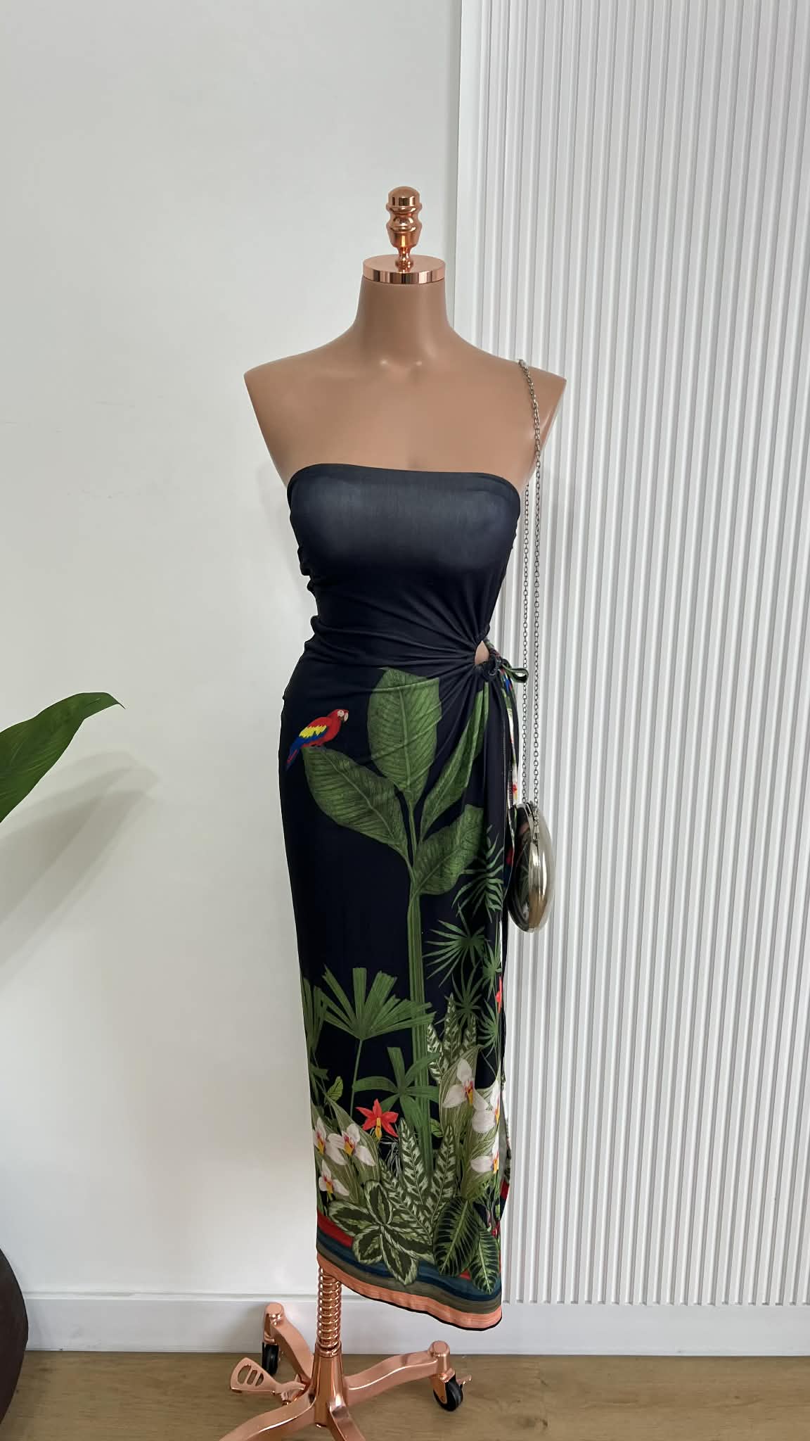 Vestido longo tomara que caia com estampa tropical exclusiva. Possui amarração lateral que valoriza a silhueta e garante um caimento elegante. O contraste do fundo escuro com a estampa de folhagens traz um visual sofisticado, perfeito para produções de verão, viagens e eventos ao ar livre.