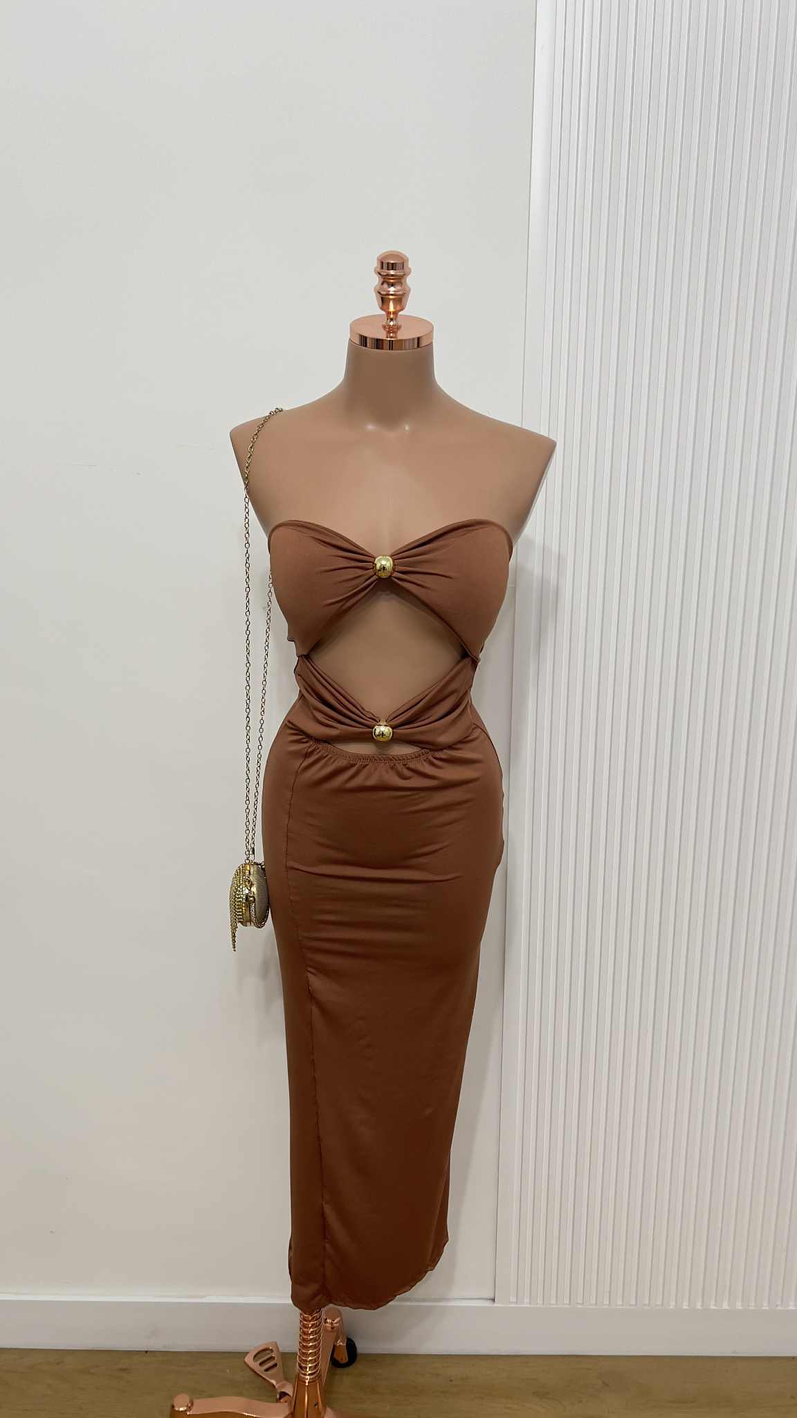 Vestido longo marrom com recortes estratégicos e detalhes dourados que realçam a silhueta com muita sensualidade. O modelo tomara que caia possui toque acetinado e caimento que valoriza o corpo, ideal para produções noturnas cheias de estilo. Um vestido elegante e poderoso, perfeito para quem gosta de ousar com sofisticação.