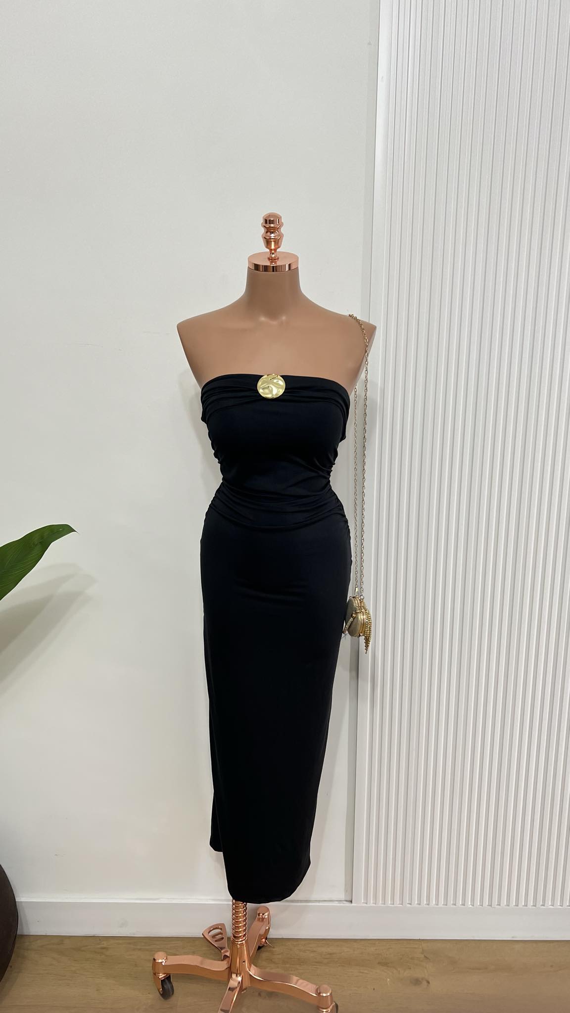 Vestido longo preto tomara que caia, com modelagem justa e tecido encorpado que realça a silhueta. Elegante e versátil para diversas ocasiões.