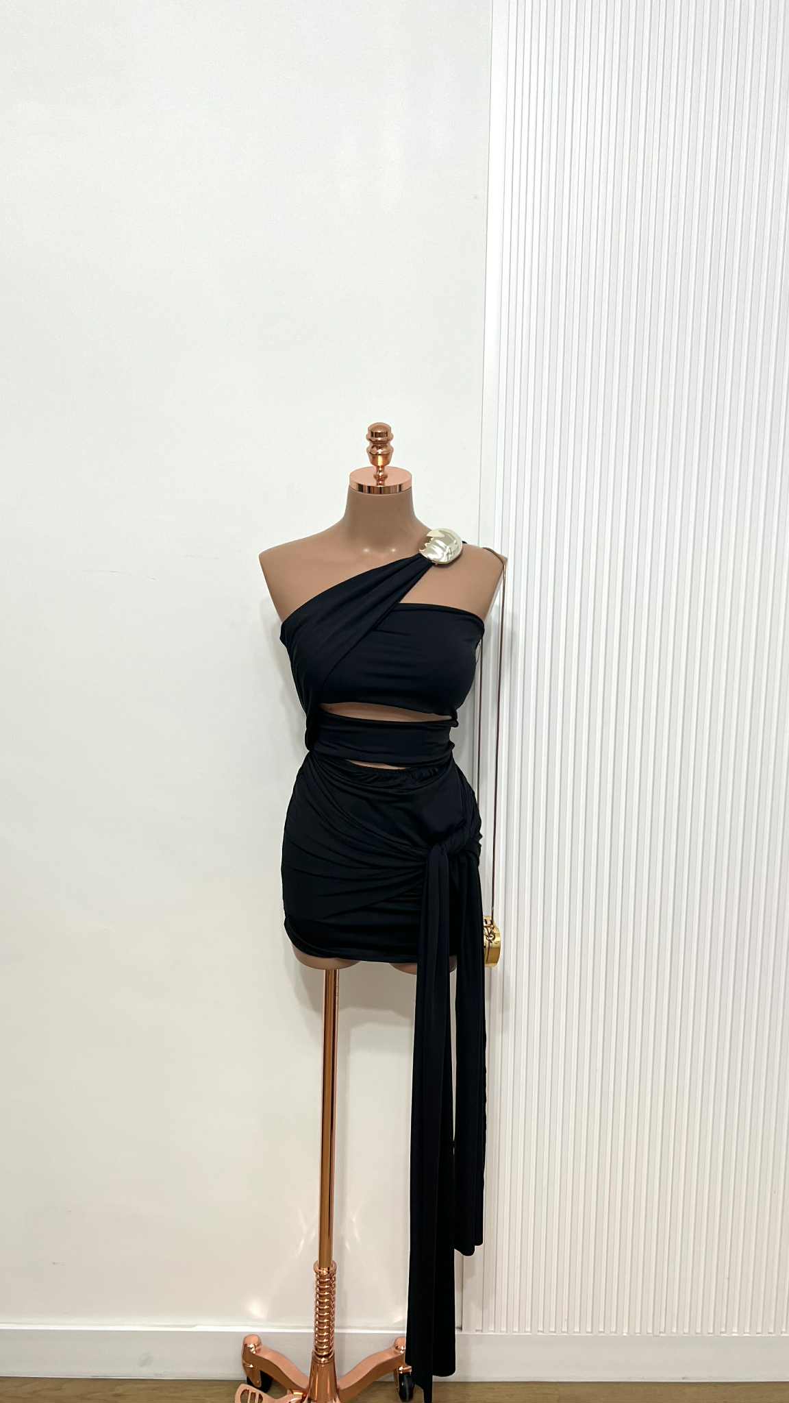 Vestido curto preto com alça única e detalhe de recorte na cintura. Possui modelagem drapeada com amarração lateral e fivela decorativa no ombro, ideal para produções elegantes e modernas.