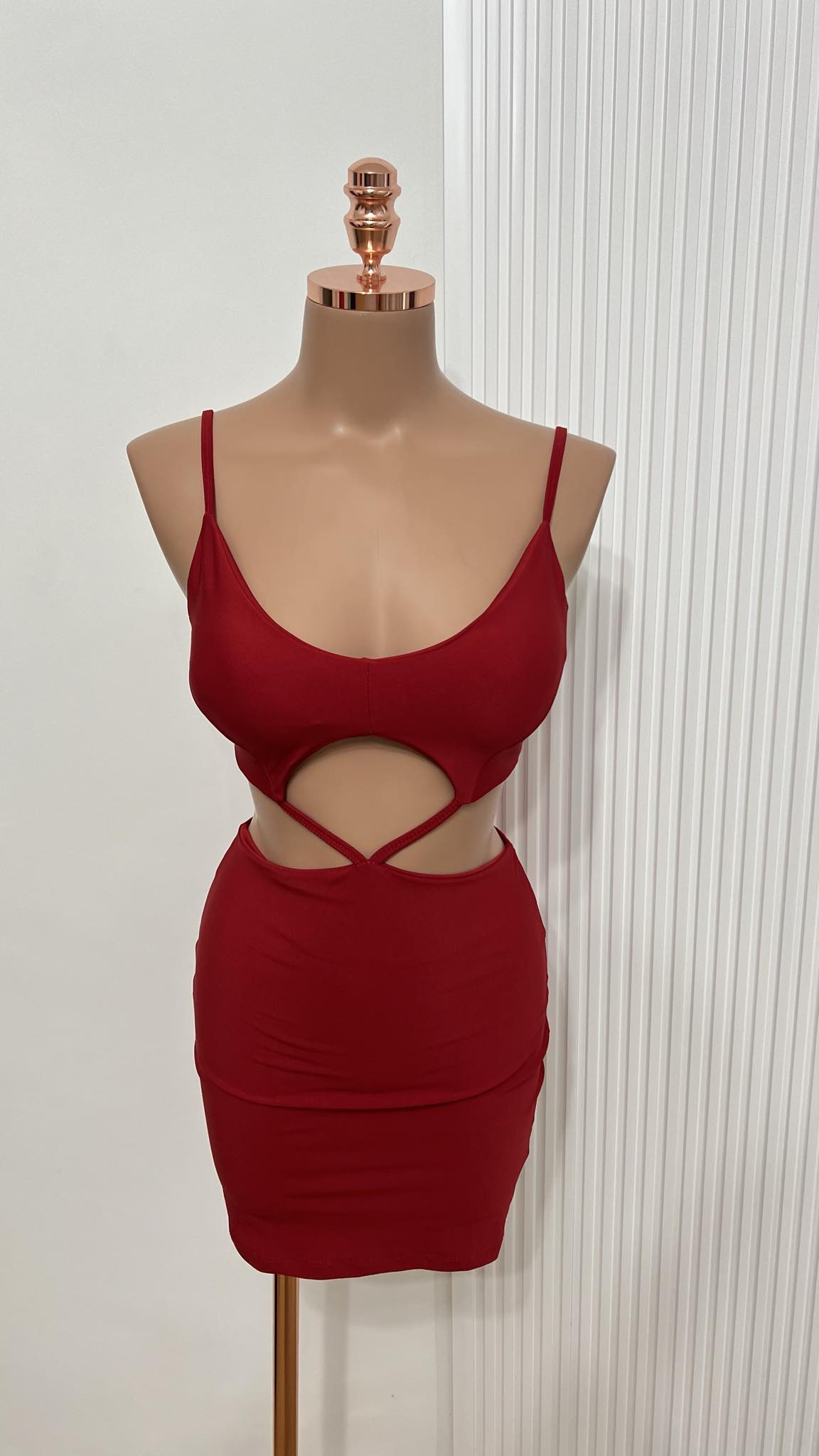Vestido curto justo ao corpo, com alças finas e detalhe de recorte frontal.