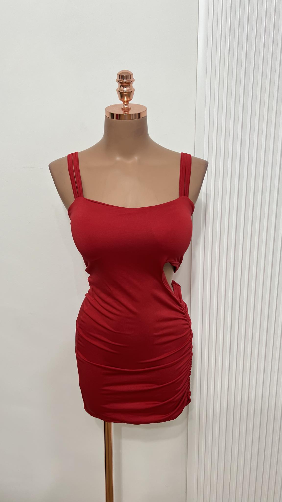 O vestido vermelho lateral vazada é perfeito para quem quer um look ousado e cheio de atitude. Com alças duplas, caimento justo e detalhe vazado na lateral com drapeado, ele valoriza as curvas e garante um visual marcante. Ideal para festas, baladas e ocasiões noturnas.